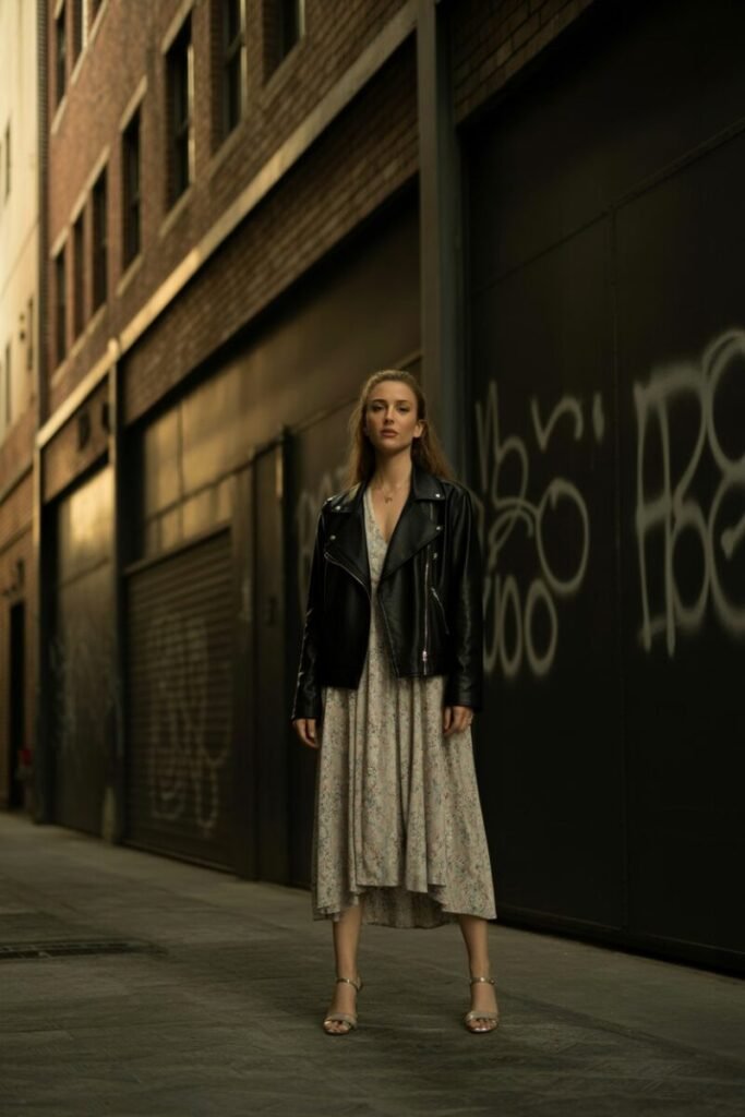 6. Leather Jacket and Floral Dress