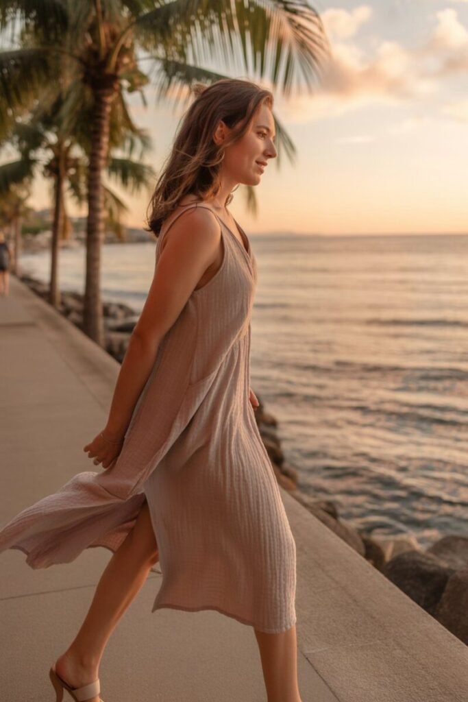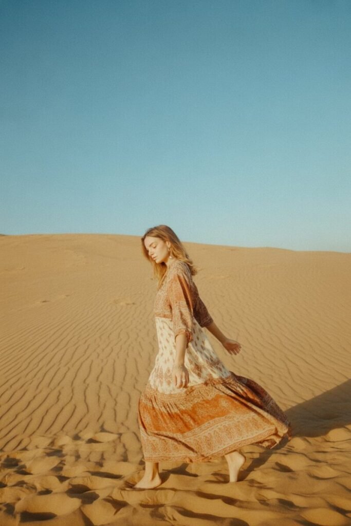 A boho maxi dress is both vibrant and laid-back all at once. It’s perfect for capturing that free-spirited vibe I adore. Choose one with flowing sleeves and intricate details from Free People. Pair with gladiator sandals and layers of beaded necklaces. This outfit is like stepping into a sun-drenched afternoon, even at night.