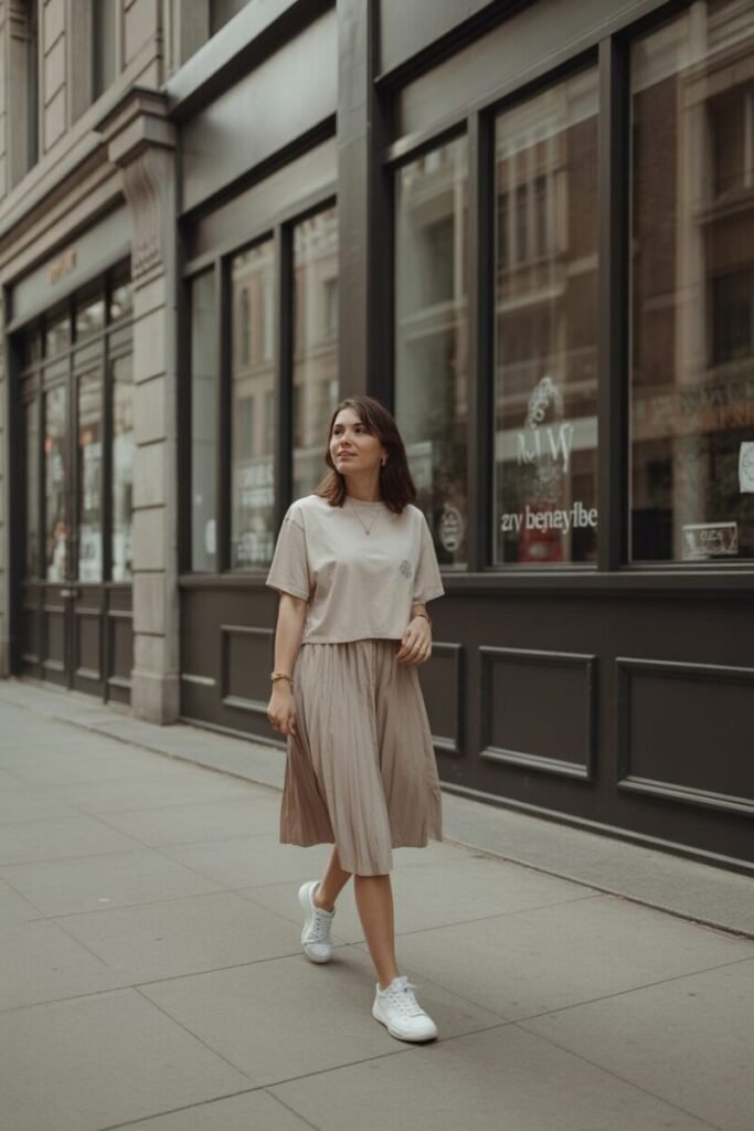 If comfort is your priority, style your beige skirt with sneakers. Add a basic tee or sweatshirt for a relaxed outfit. This look is perfect for busy days when you still want to look cute. It’s easy, practical, and trendy. You can also add a backpack or tote bag. This outfit works for travel, errands, or daily wear. It proves that you don’t need heels to look stylish.