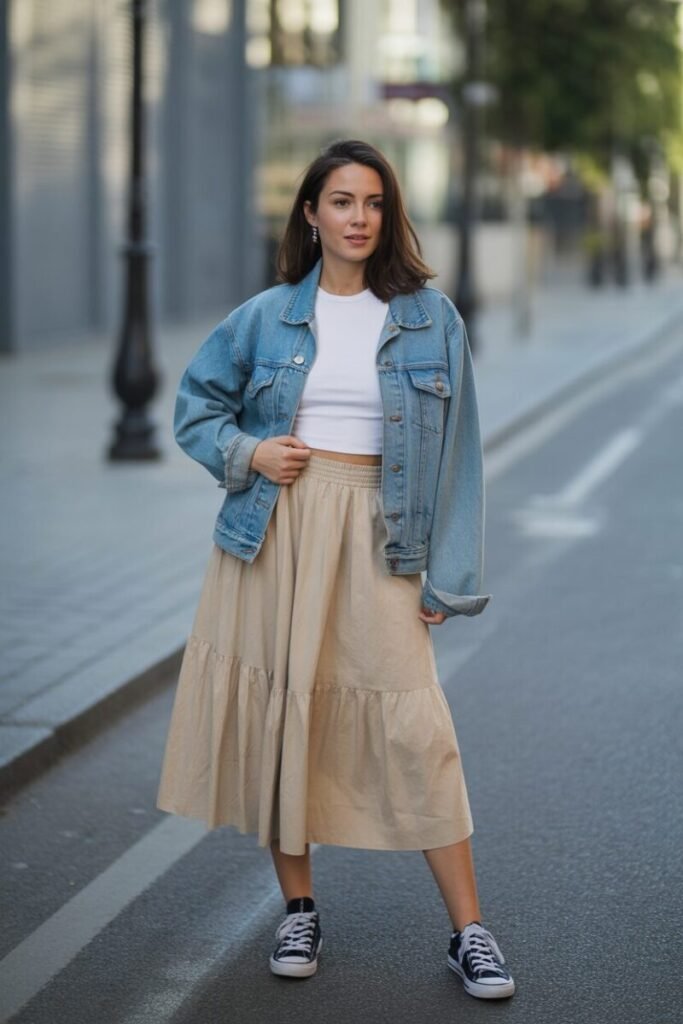 This outfit gives a cool and casual vibe. Pair your beige skirt with a basic top and layer it with a denim jacket. It’s perfect for everyday wear and looks super relaxed. Add sneakers or flats for comfort. This look is great for college, casual outings, or travel days. You can also wear a messy bun or ponytail to keep it effortless. The mix of denim and beige creates a balanced and trendy feel. It’s simple, practical, and always in style.