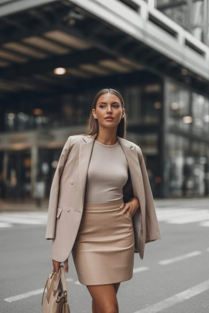 For a more structured and classy outfit, add a blazer to your beige skirt look. Wear a basic top inside and layer with a fitted blazer. This creates a powerful yet feminine style. Add heels or boots for a polished finish. Perfect for work, meetings, or formal events. Choose neutral tones like beige, black, or white for a clean look. This outfit makes you feel confident, stylish, and ready for anything.