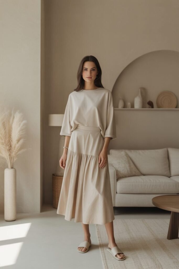 5. Minimal Beige Skirt with Neutral Top