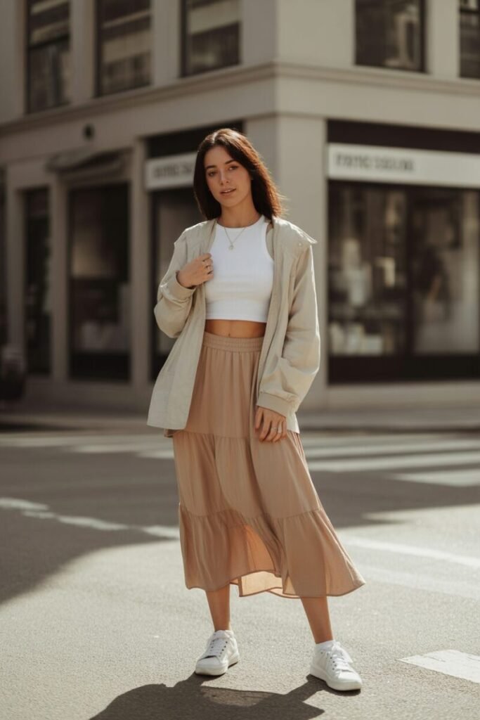 This is the ultimate clean and fresh outfit. Pair your beige skirt with a white crop top for a light, airy look. It feels effortless and perfect for sunny days. Add white sneakers or sandals to keep the vibe casual and relaxed. You can also layer with a light cardigan if needed. This outfit works great for brunch, shopping, or a casual hangout. Keep accessories minimal—maybe a small gold necklace or tote bag. It’s simple, soft, and very Pinterest-worthy. If you love neutral tones, this look will quickly become your go-to favorite.