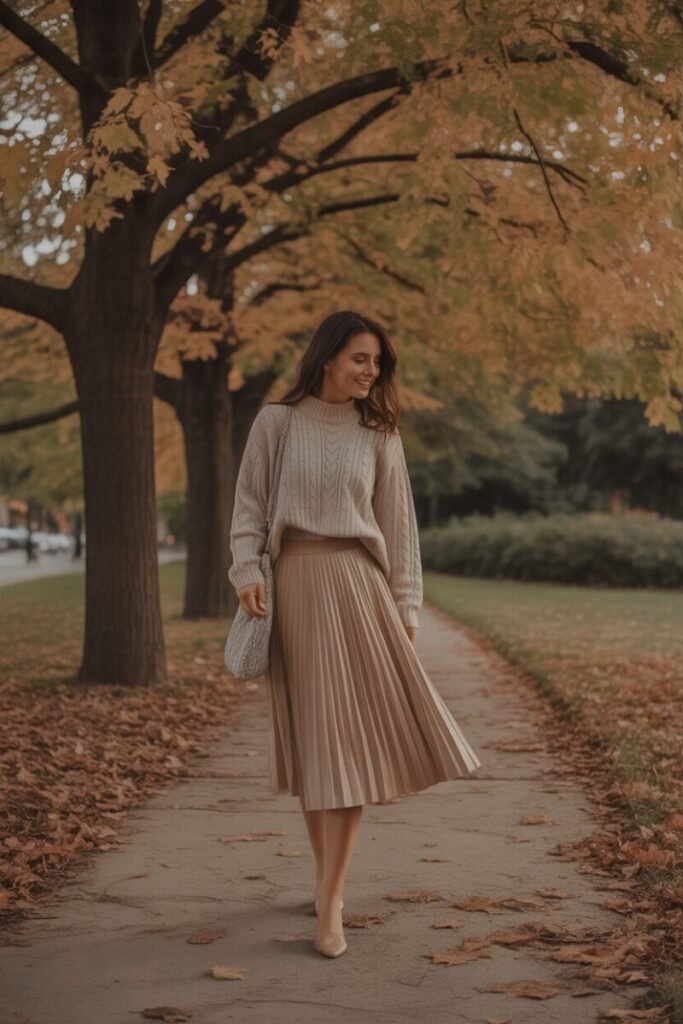 A knit top adds texture and warmth to your outfit. Pair it with your beige skirt for a soft, cozy look. Choose light colors like cream or pastel shades. Add ankle boots or flats for comfort. This outfit is perfect for chilly days when you want to stay stylish. It feels warm, calm, and very aesthetic. Add a scarf or small bag to complete the look. It’s simple, cozy, and beautiful.