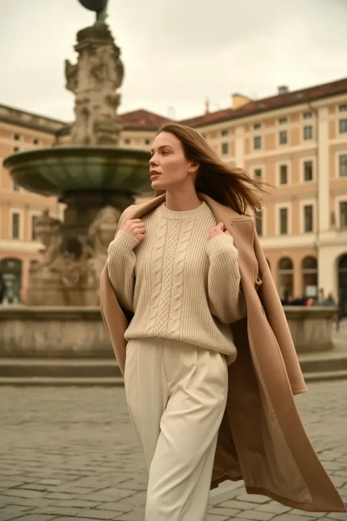 Stick to neutral or deep autumn tones like chocolate, cream, or burgundy. Add a long wool coat for extra warmth on chilly evenings. This look is perfect for walking through old European streets while feeling comfortable and confident. It flatters many body types and doesn’t require much styling. A structured handbag completes the aesthetic. It’s cozy, stylish, and ideal for those dreamy golden hour photos.