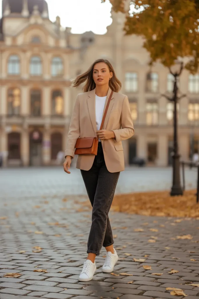 Pair with ankle boots or sleek sneakers depending on your plans. Add a soft scarf to balance the structured jacket and keep warm. This outfit works beautifully in cities like Berlin or Amsterdam where street style shines. It’s easy to recreate with basics you already own. Practical, stylish, and great for cooler fall days. Effortless layering makes this look both functional and flattering.