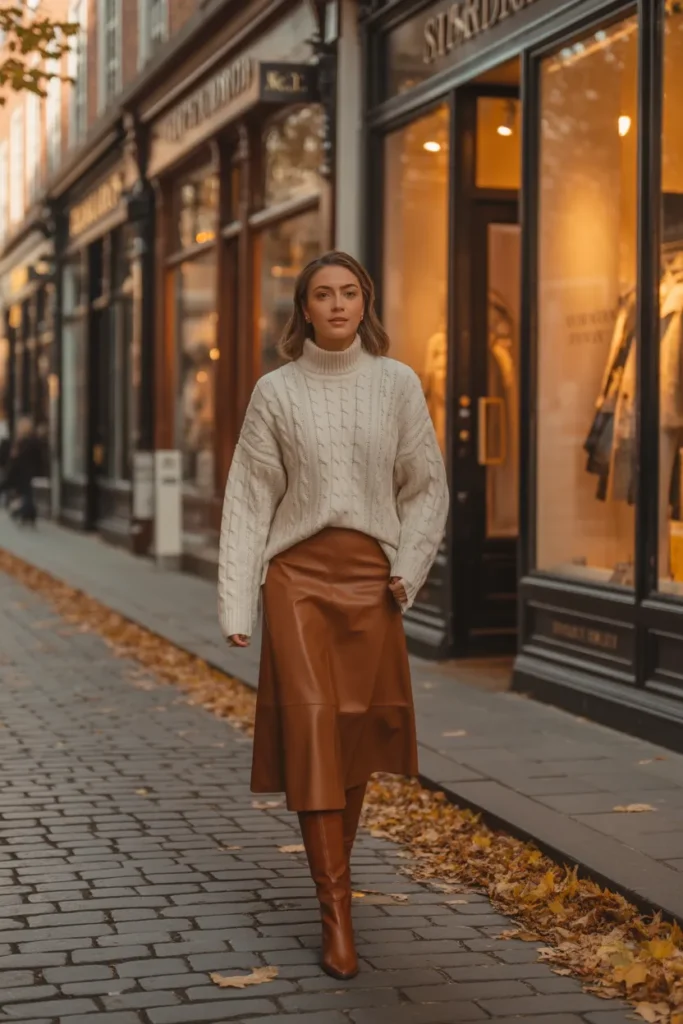 Mixing textures makes fall outfits more interesting. A chunky knit sweater paired with a leather or faux leather skirt creates that perfect cozy-meets-chic vibe.