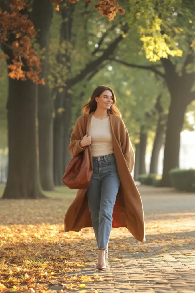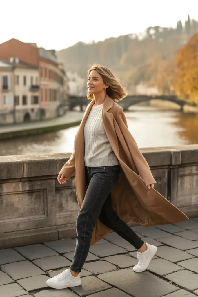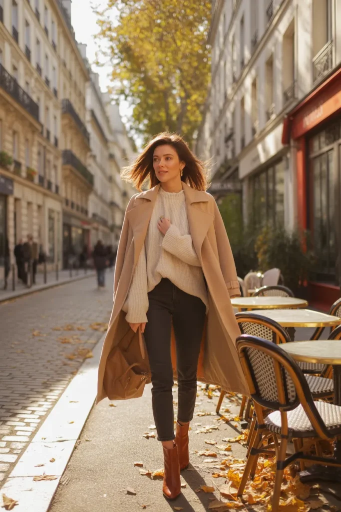 This combination is perfect for walking tours and travel days. It’s comfortable but still very put together. Choose a coat in camel, grey, or black for versatility. Add a tote bag big enough for your essentials. This outfit balances comfort and style, making it ideal for busy sightseeing days. Clean, effortless, and easy to recreate.