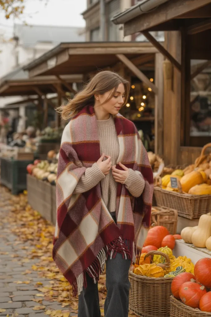 Layer a simple knit, jeans, and boots, then wrap yourself in a plaid or neutral scarf. It adds color, warmth, and texture instantly. This look is perfect for chilly mornings and outdoor markets. Scarves are also easy to pack and transform basic outfits into something special. Cozy, practical, and so aesthetic for fall photos.