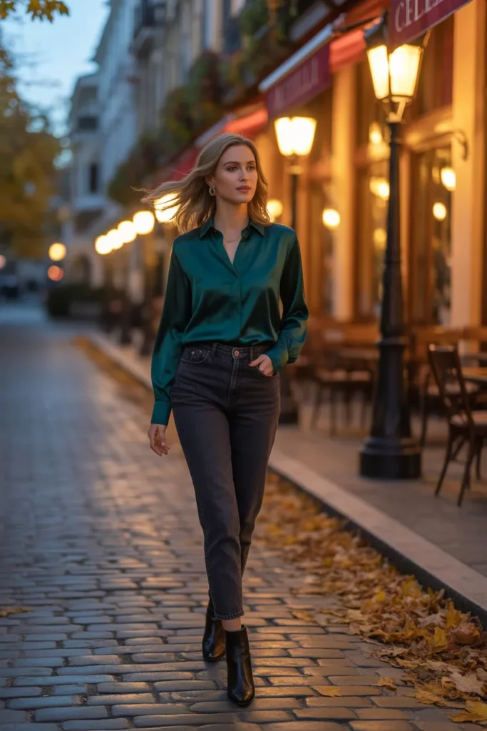 A soft silk or satin blouse adds elegance without feeling overdressed. Pair it with dark jeans and ankle boots for a refined but relaxed fall outfit.