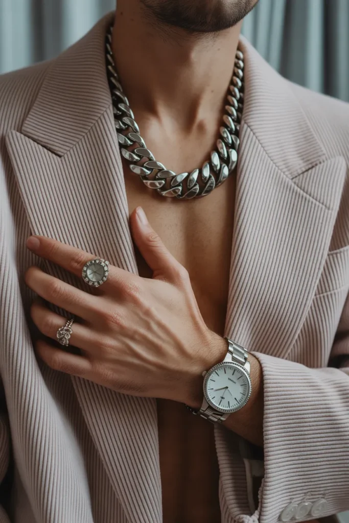 Chains, rings, or a vintage watch add personality.