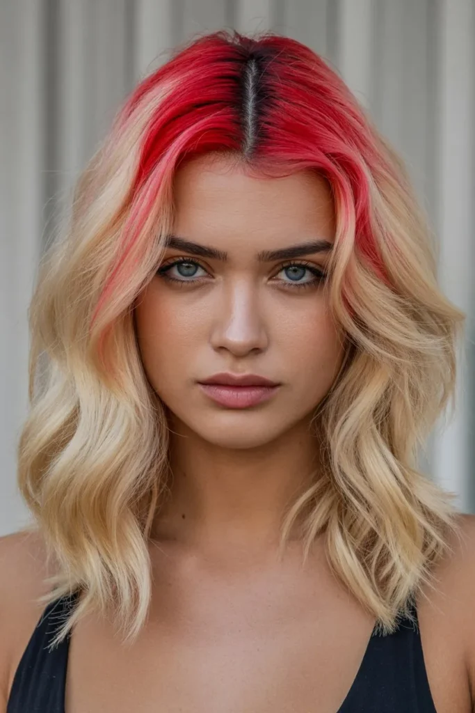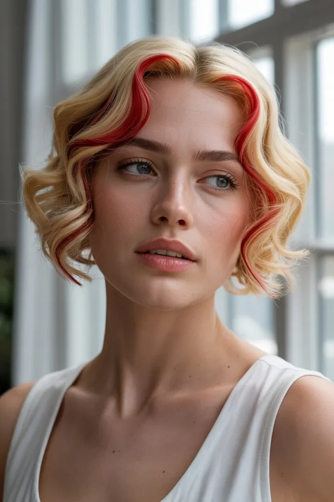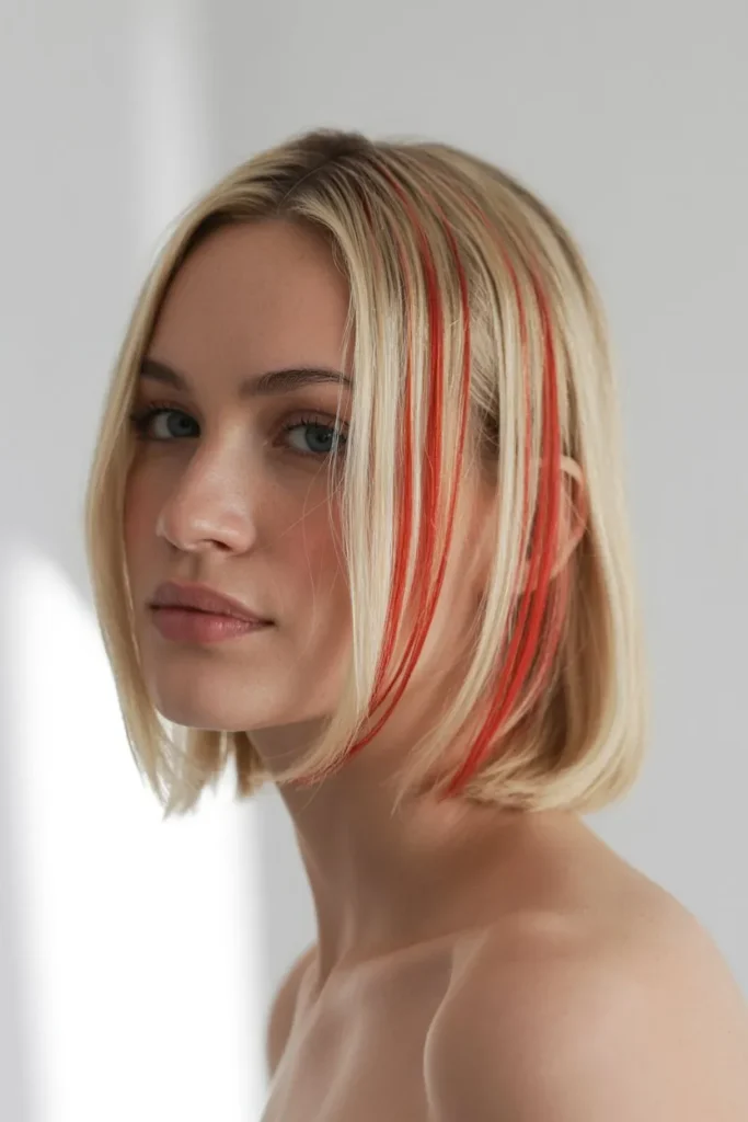 A blonde lob with red highlights looks modern and chic. The shorter length keeps the style fresh, while the red adds personality. It is easy to style and perfect for everyday wear.