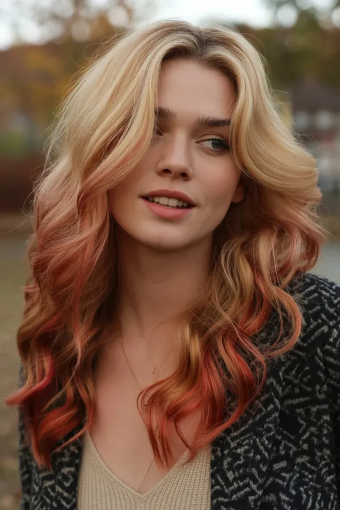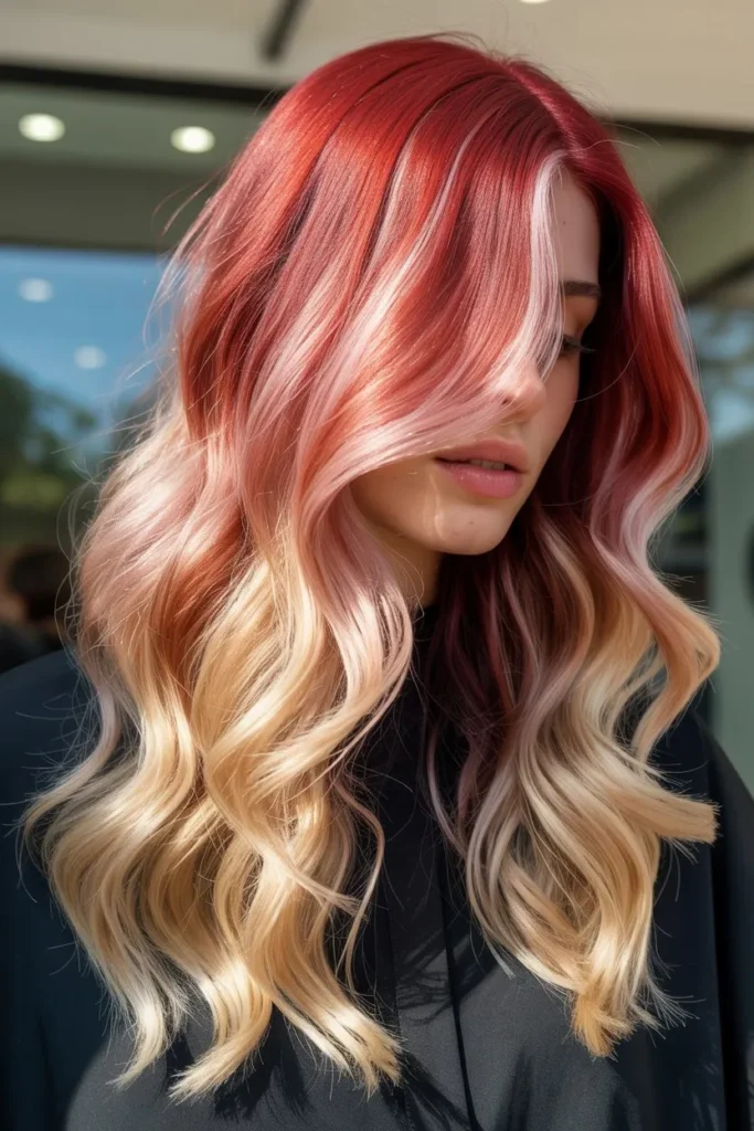 This style blends light red tones into blonde hair for a soft and romantic look. It feels natural, feminine, and effortless. Loose waves make the color look even more dreamy and smooth.