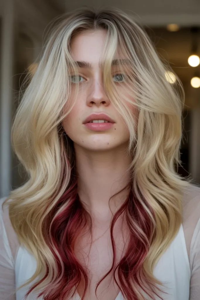 Long layered blonde hair with red highlights looks timeless and luxurious. The layers help the color stand out beautifully. This style looks amazing with waves or soft curls.
