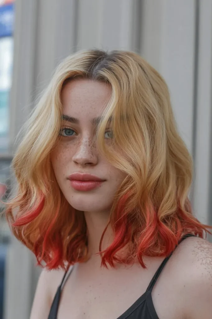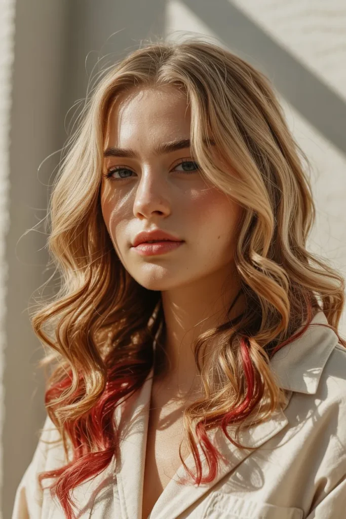 Red tips add a playful and fun touch to blonde hair. The color is focused only on the ends, making it a safe choice for first-time color lovers. This style feels youthful and trendy.