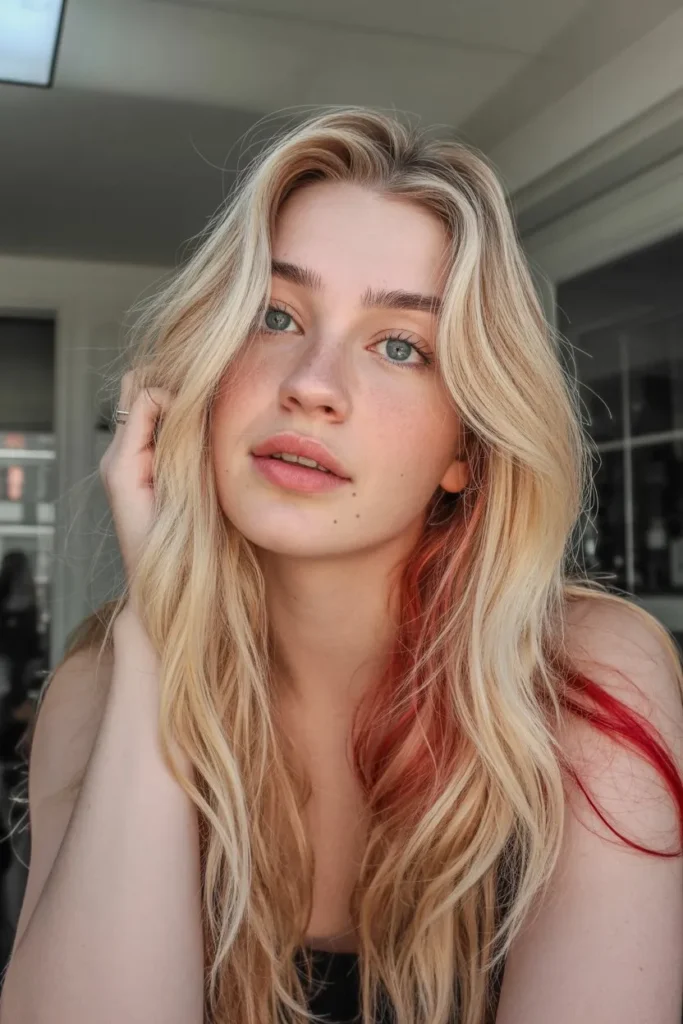 Thin red highlights add gentle warmth to blonde hair. They are perfect if you want a change that looks classy and not too bold. This style works well for everyday life and professional settings.