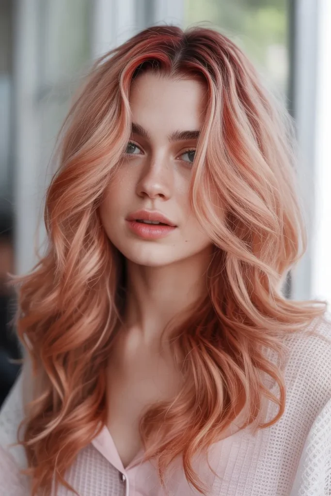 Rose-gold tones mix soft red and pink shades with blonde hair. The result is elegant, modern, and very Pinterest-inspired. This look feels dreamy and perfect for special moments.
