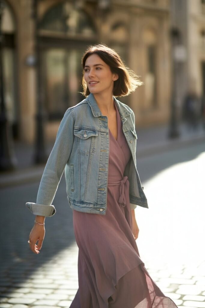 13. Denim Jacket Over Wrap Dress