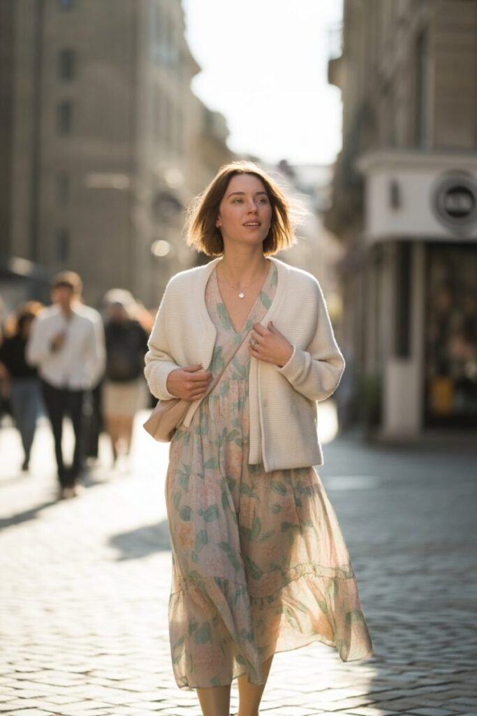 Layering a cardigan over a patterned dress is perfect for those warmer spring days. Honestly, this is my go-to transition piece. Choose dresses with pastel floral motifs or geometric patterns and a soft cardigan in a neutral hue. The contrast of textures here works like a charm!