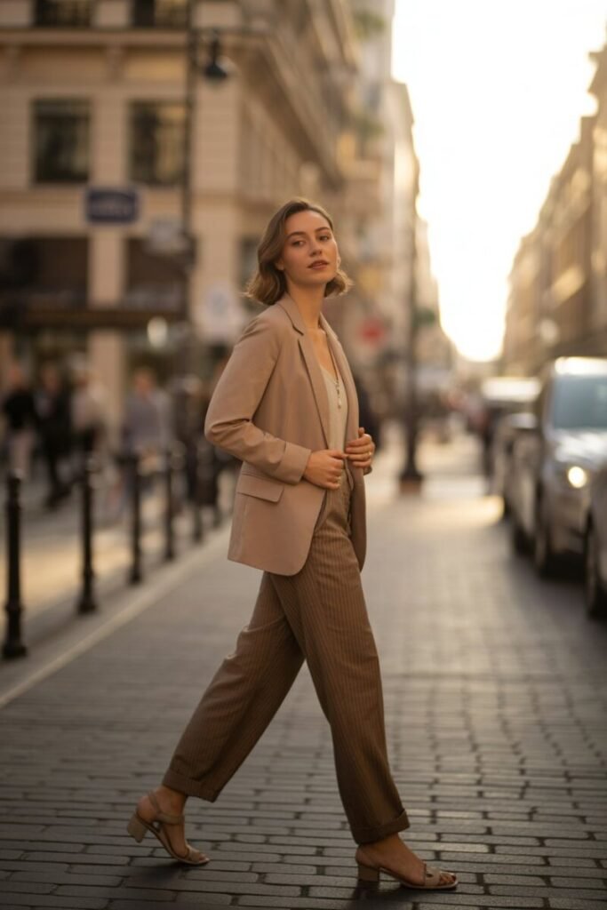 A classic blazer paired with well-fitted trousers is a timeless business casual outfit idea. I use this look all the time. Blazers offer structure, and when crafted from rich wool or breathable linen, they bring both comfort and style. Match it with neutral or navy trousers from brands like Banana Republic or Express. Bonus points if you add a crisp white shirt underneath for that fresh, spring-ready vibe!